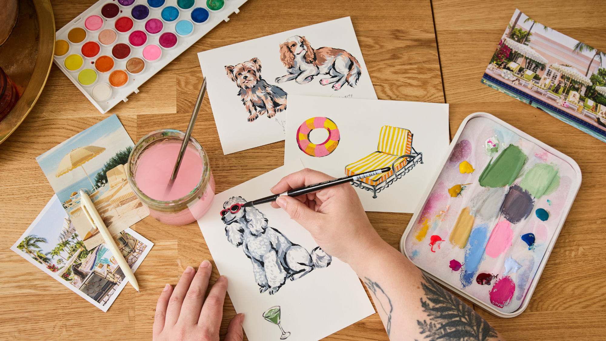 Step into a retro-inspired resort getaway—complete with striped umbrellas, pastel poolside vibes, and a very stylish pack of pups. Palm Royale Pooches is our latest dog-lover-approved print, dreamed up as the ultimate vacation scene for our four-legged friends. From playful details to glamorous breeds, this one’s all about sunshine, whimsy, and summer fun.