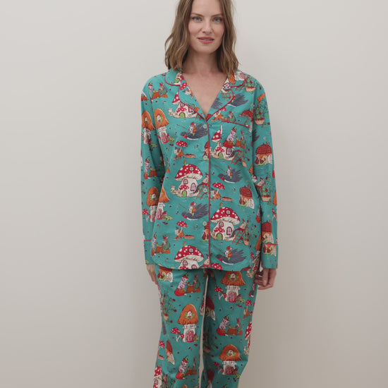 Step into an enchanted forest with our Autumn Critters woodland print sleepwear in rich Teal. These button-down PJs feature playful creatures tending to their toadstool homes. This organic cotton loungewear features a relaxed button-down top and comfortable pants with deep pockets. Perfect for crisp mornings and cozy evenings. Explore our collections of pajama sets, pajamas, and long sleep sets.