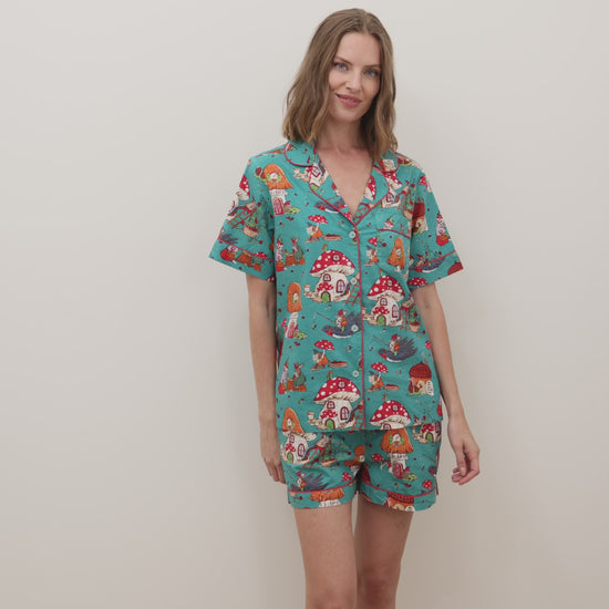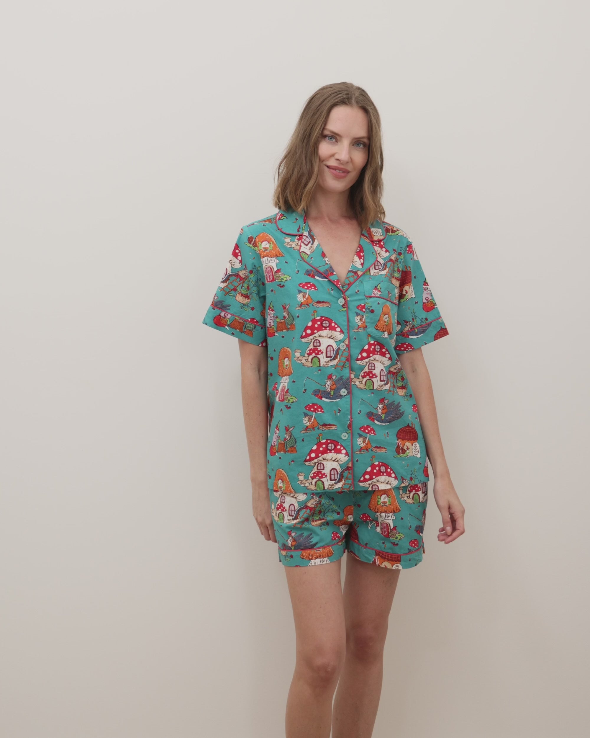 Step into an enchanted forest with our Autumn Critters cotton pajama set in rich Teal. This woodland print sleepwear features adorable forest friends tending to toadstool homes on organic cotton. The relaxed button-down top pairs with coordinating shorts, complete with pockets for your nighttime essentials. Perfect for magical fall mornings and cozy nights all season long. Shop our pajama sets and short sleep sets for more whimsical prints.