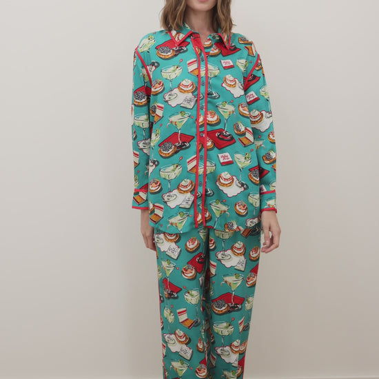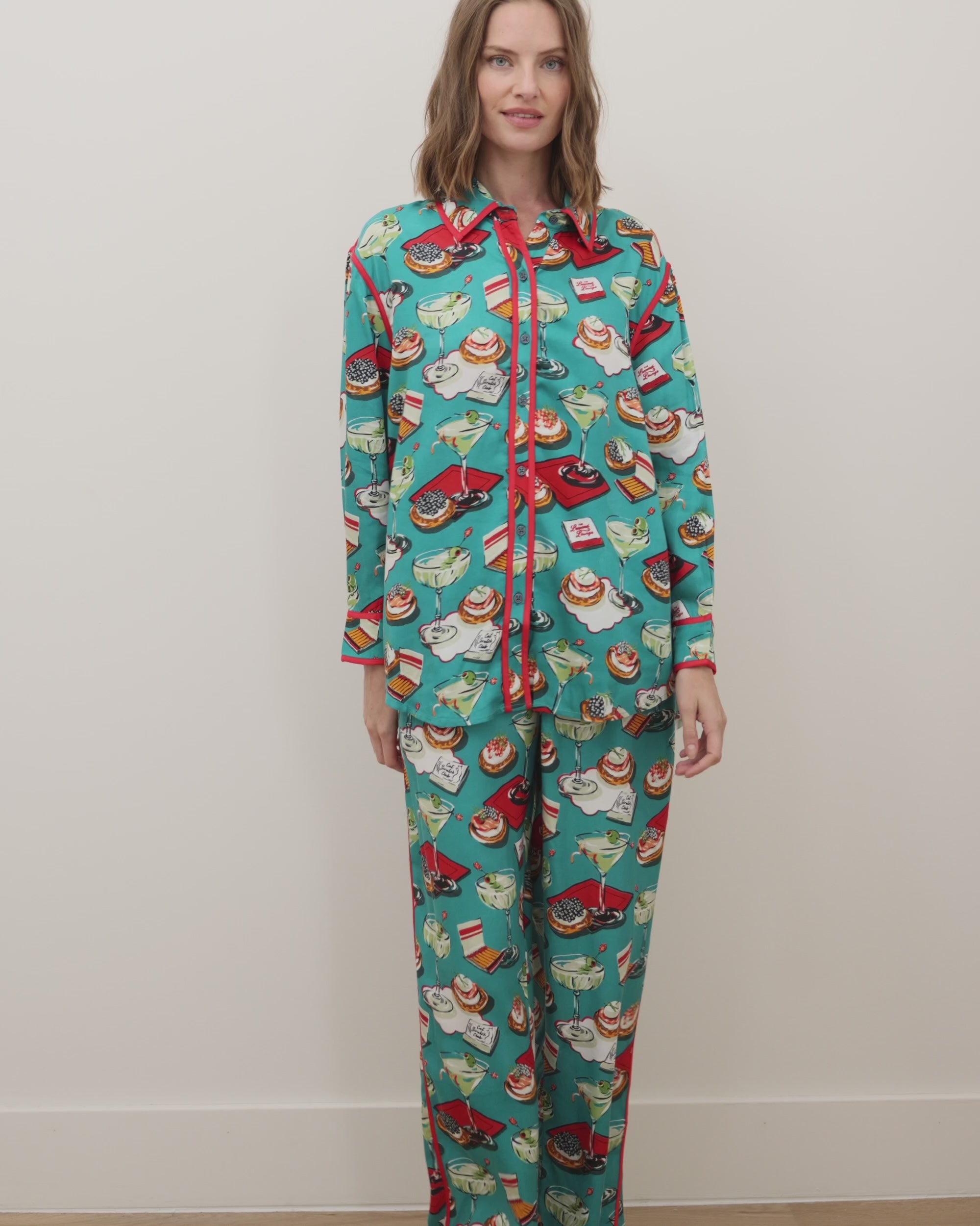 Step into vintage cocktail-hour elegance with our Blinis & Martinis satin pajama set in Mid-Century Blue. This chic blue lounge set features an oversized button-down shirt with contrasting trim and tailored lounge pants with accessible pockets. Crafted from thermoregulating Eco Satin, this satin pajama outfit brings retro glamour to weekend lounging or evening nightcaps. Explore our pajamas, sleep shirts & nightgowns, and pajama sets.