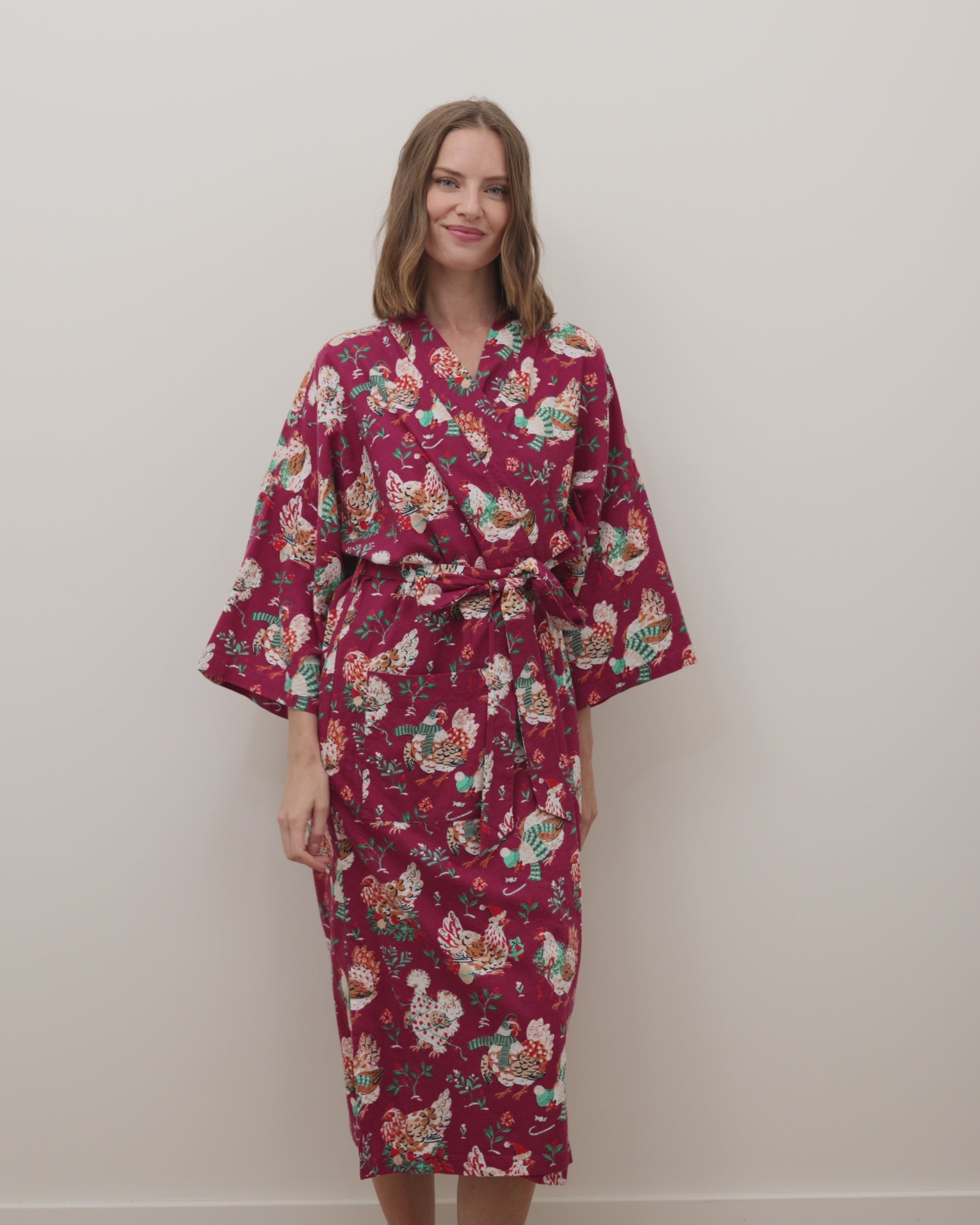 Wrap yourself in holiday magic with our Holiday Hens winter flannel robe in Burgundy. This festive sleep robe features charming hens in holiday attire on lightweight organic flannel. With elegant full-length coverage, deep pockets, and a matching belt for a cinched silhouette, it's the perfect holiday flannel robe for chilly mornings by the fireplace. Explore our flannel pajamas, robes, and holiday collection.