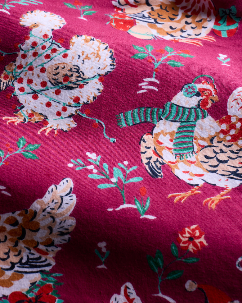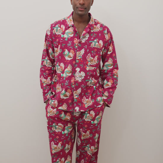 Deck the halls with our Holiday Hens men's pajamas in rich Burgundy. These flannel men's pajamas feature feathered friends in winter accessories on breathable organic flannel. The lightweight pajama set offers a roomy button-down top and relaxed pants with deep pockets and adjustable comfort. Perfect holiday men's sleepwear for cozy winter nights or matching family PJs. Explore our flannel pajamas, holiday collection, and men’s collections.