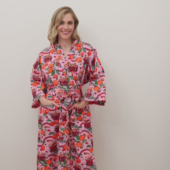 Steep yourself in holiday magic with our Mulled Wine cotton robe in Pink Tinsel. Glass mugs, cranberries, and spices dance across breathable organic cotton in this festive hand-drawn print. Our holiday robe features an elegant floor-grazing length, deep pockets, and a matching belt for a custom silhouette. Perfect cotton sleepwear layer for holiday breakfast prep. Explore our robes and holiday collection for more seasonal delights.