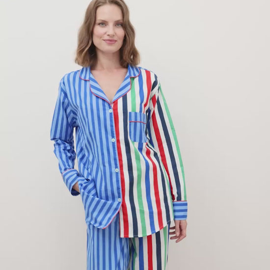 Wrap yourself in comfort with this striped cotton pajama set. Featuring nautical-inspired stripes on breathable organic cotton poplin, this cotton sleepwear set brings sophisticated ease to your evening routine. The relaxed button-down top pairs perfectly with mid-rise pants featuring pockets and an adjustable drawstring. A versatile holiday pajama set for cozy nights in. Browse more pajama sets, holiday collection favorites, and pajamas.