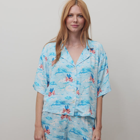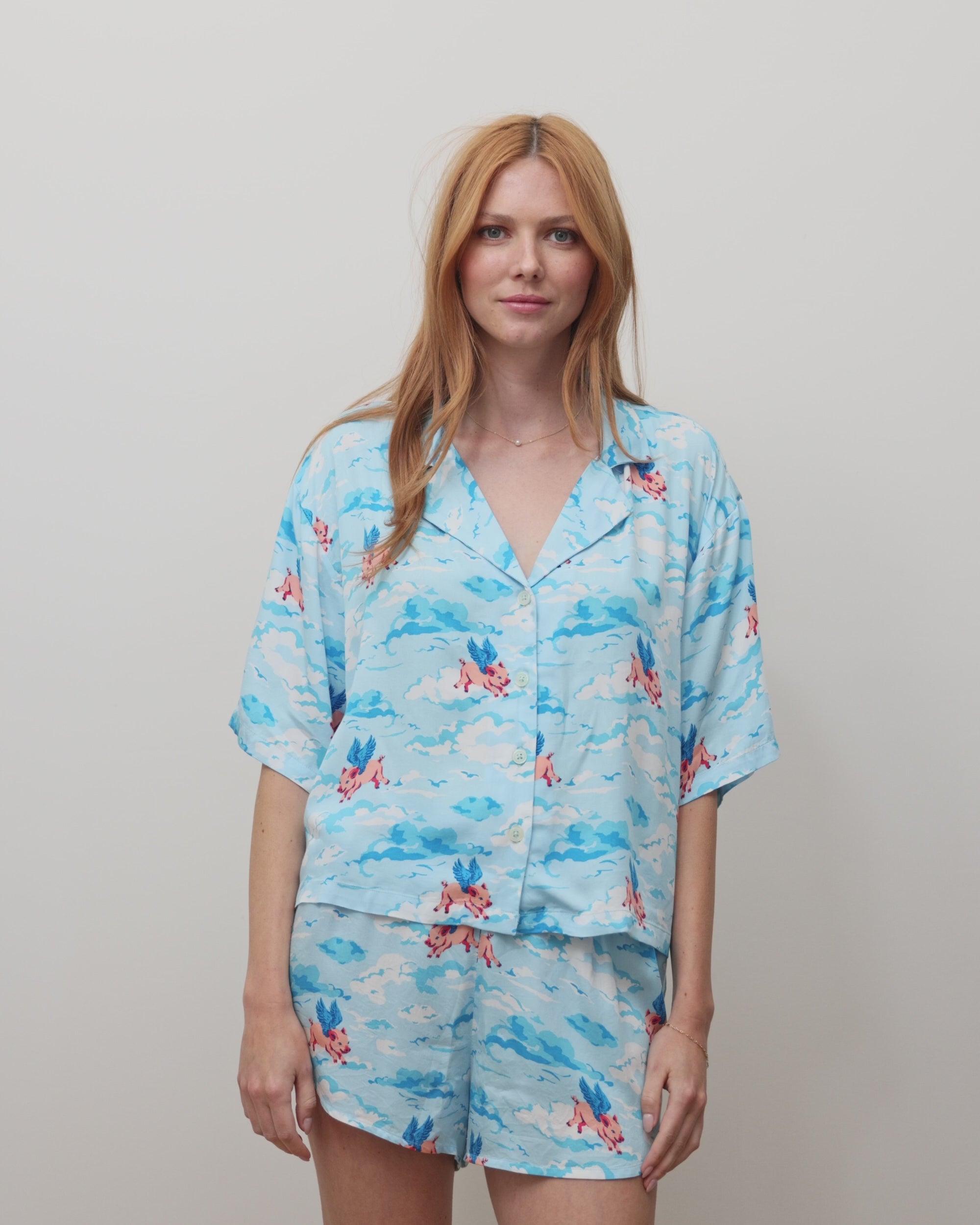 Dream the impossible. Winged pigs soar through the clouds on this satin pajama set, featuring our fan-favorite whimsical print on silky Eco Satin. The satin shorts set features a relaxed, cropped top and a roomy silhouette for all-night comfort. Perfect Valentine’s satin pajamas for the optimist in your life. Please note, this style does not include pockets. Explore more pajama shorts, satin PJs, and Valentine's styles.