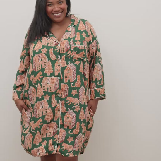 Bake up holiday magic with our Gingerbread Party satin sleep shirt in Hunter Green. This festive nightshirt features delightful gingerbread motifs on luxurious Eco Satin with button-front styling and convenient pockets. The relaxed silhouette offers effortless comfort for sweet dreams and cozy mornings. Our satin holiday nightie adds bold charm to your satin sleepwear collection. Discover more styles in our sleep shirts and holiday pajamas.