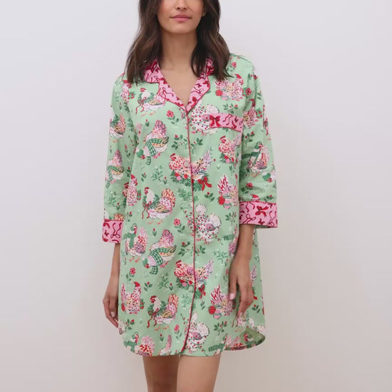 Discover festive charm in this holiday sleep shirt in Sage. Cheerful hand-drawn hens don scarves and earmuffs across breathable organic cotton that gets softer with every wash. This button-down nightshirt features a relaxed fit with comfortable three-quarter sleeves and pockets for easy lounging. Makes a delightful seasonal gift, paired with matching family pjs. Explore our pajamas, sleep shirts, and holiday collection for more cozy styles.