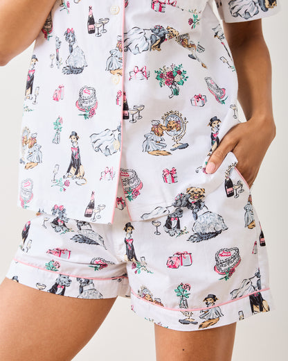 • Fit: Button-down top with relaxed fit and comfortable silhouette. Mid-rise shorts featuring elastic waistband, adjustable drawstring, and 2 ¼" inseam.
