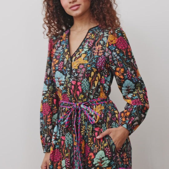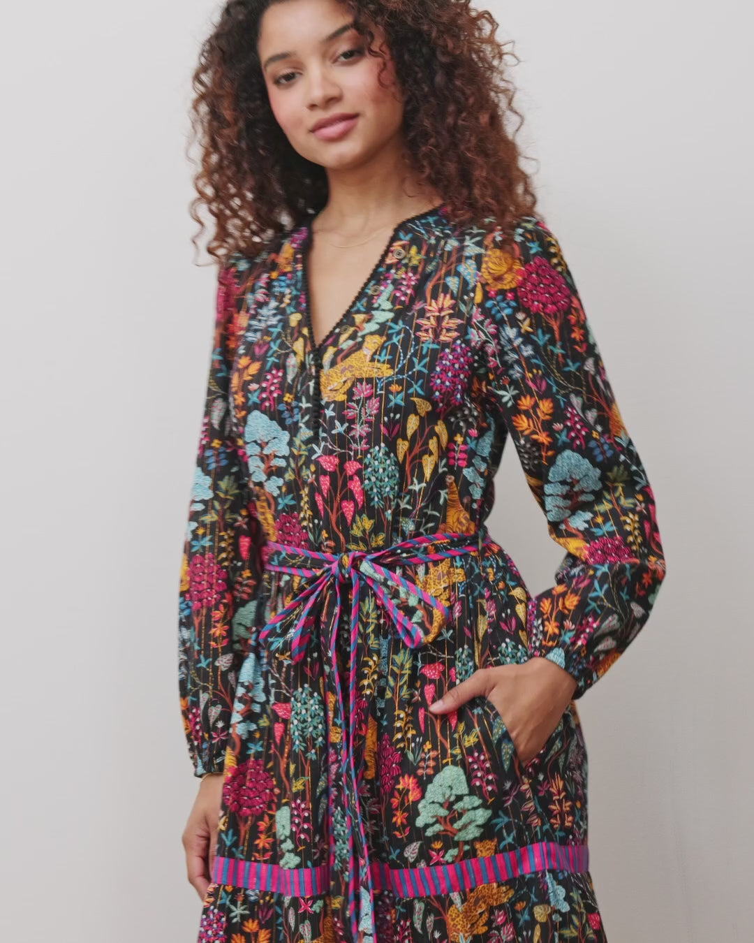 Walk on the wild side with our One in a Million animal print dress. Tigers and leopards roam vibrant foliage on breathable organic cotton cambric with a subtle Lurex shine. This holiday cotton dress features charming puff sleeves, delicate lace trim, and an elegant midi length with pockets. A conversation-starting holiday party dress for festive gatherings. Explore more dresses, holiday collection pieces, and midi dresses.