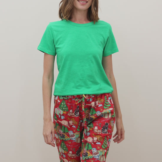 Make it a meowy Christmas morning with these festive pajama pants in Red Bow. This holiday cat sleepwear features playful felines decking the halls across breathable organic cotton poplin. With a comfortable mid-rise fit, adjustable drawstring waistband, and pockets, these cat print PJ pants are made for cozy holiday mornings. Explore more pajama bottoms and complete your Christmas PJ set with our holiday collection.