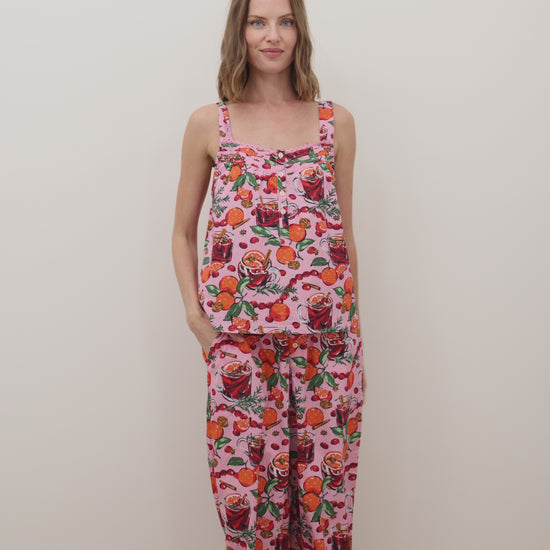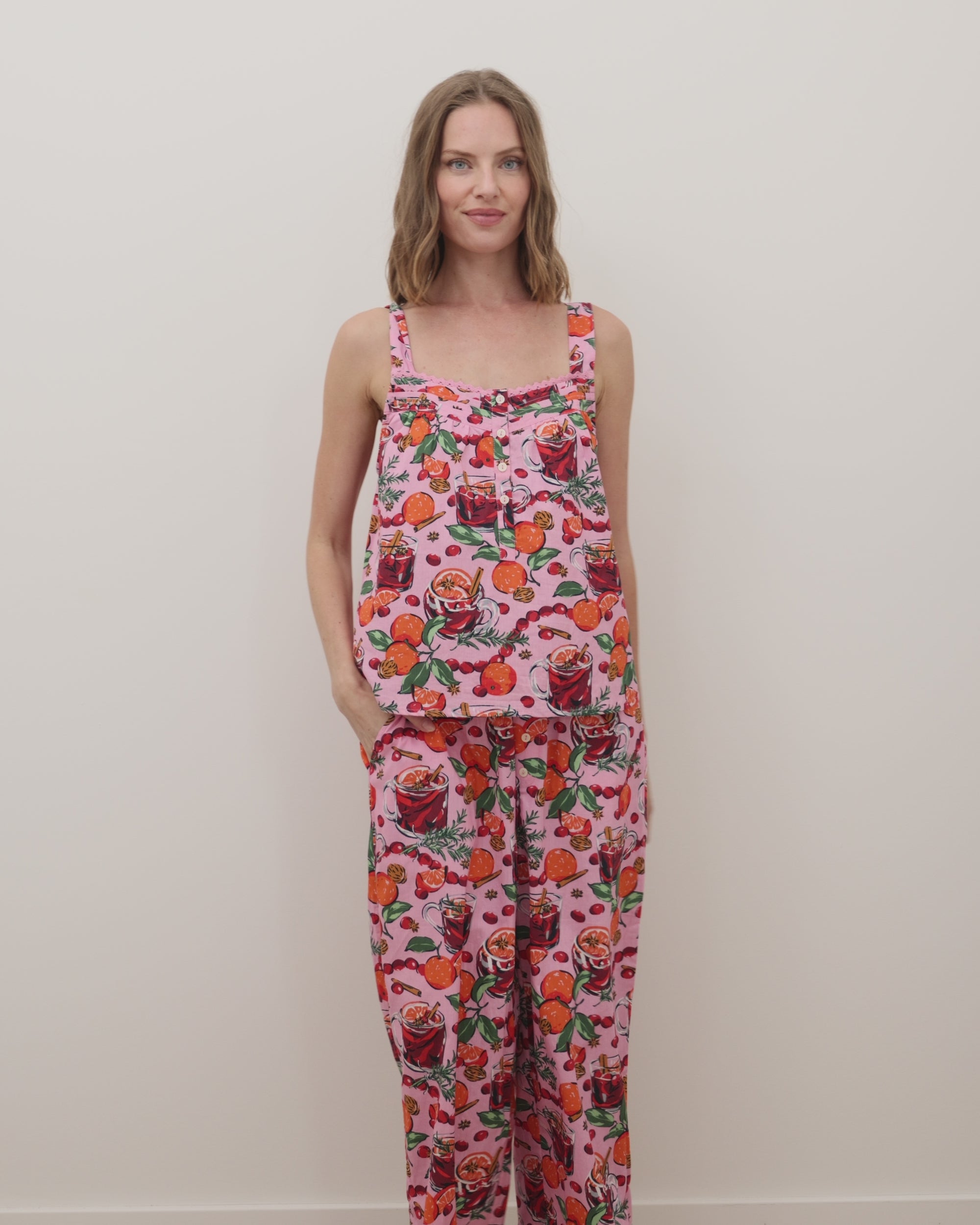 Warm up with our Mulled Wine cropped PJ set in Pink Tinsel. This festive sleepwear captures holiday magic with hand-drawn mugs and spices, on breathable cotton pajamas that get softer with every wash. The sleeveless top offers an easy silhouette, paired with chic wide-leg pants featuring pockets and a comfortable cropped length. Discover more joyful prints in our cropped pant pajama sets and holiday collection.
