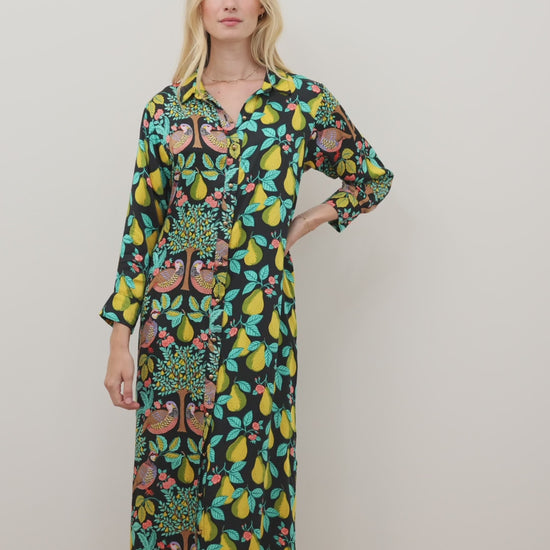 Add festive charm to your wardrobe with our Mariane holiday midi dress. This sophisticated bird print dress features graceful partridges among pear-filled branches on soft modal with a luminous, drapey finish. The elegant silhouette includes a full button-down front, double leg slits, and pockets. A chic holiday party dress for Christmas events. Explore more dresses, our holiday collection, and midi dresses.