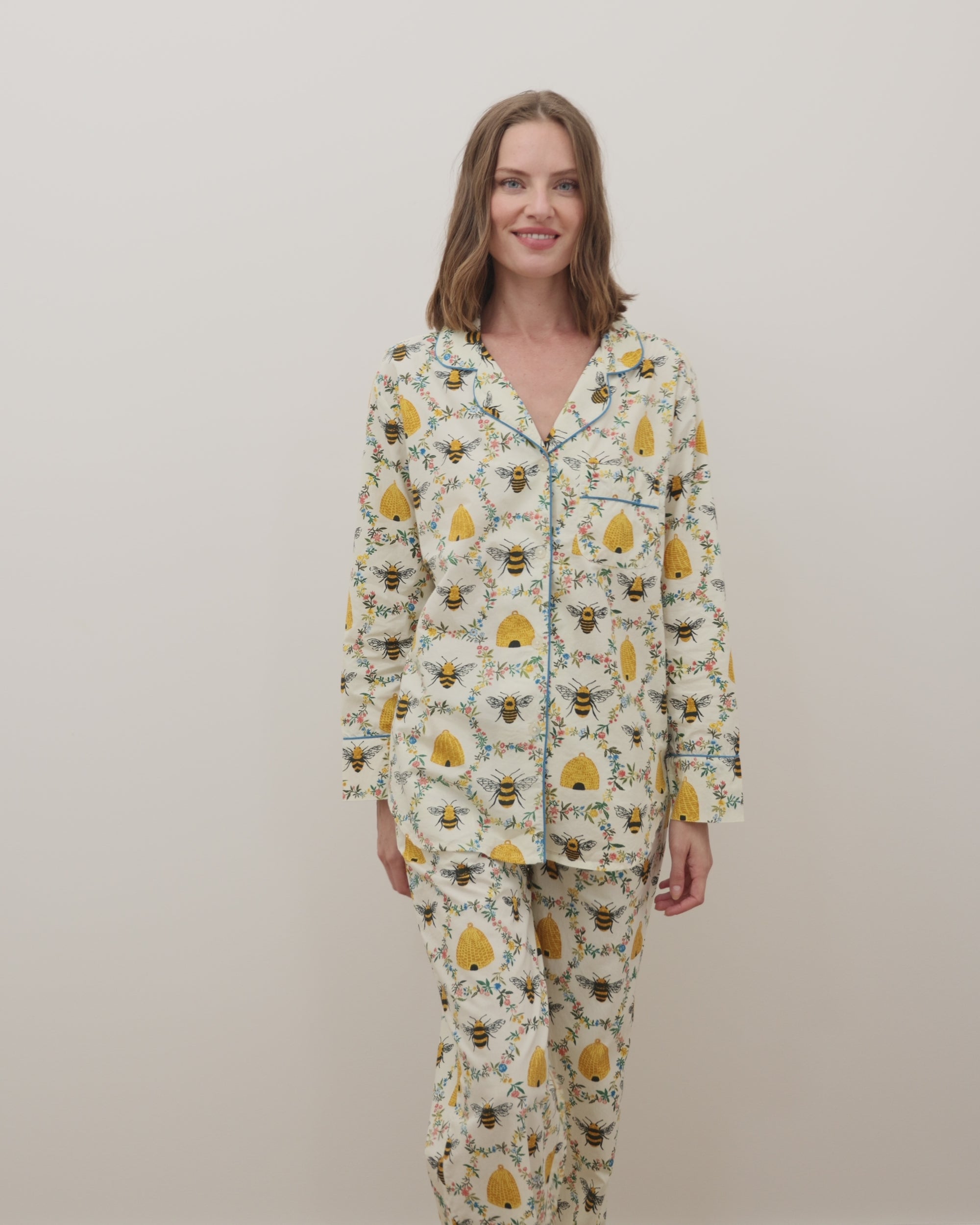 • Fit: Button-down top with relaxed fit that's roomy and chic. Mid-rise pants with elastic waistband, adjustable drawstring, and 28" inseam.